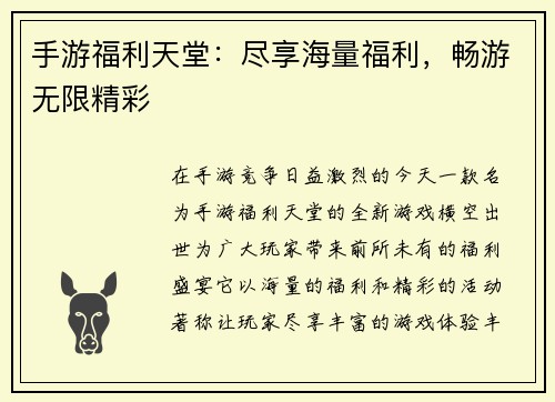手游福利天堂:尽享海量福利,畅游无限精彩