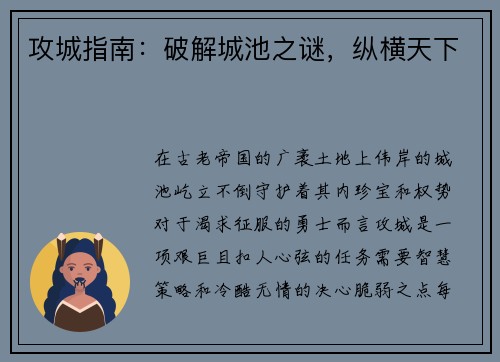 在古老帝国的广袤土地上,伟岸的城池屹立不倒,守护着其内珍宝和权势。对于渴求征服的勇士而言,攻城是一项艰巨且扣人心弦的任务,需要智慧、策略和冷酷无情的决心。 脆弱之点: 每一座城池都有其弱点,就像一件精...