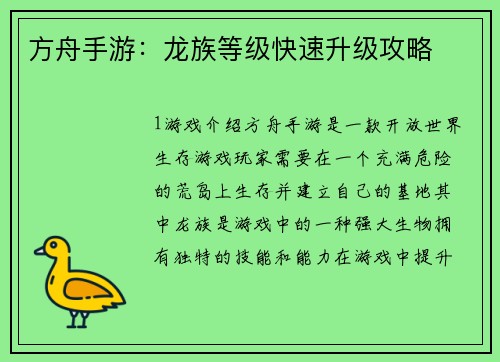 1. 游戏介绍 方舟手游是一款开放世界生存游戏,玩家需要在一个充满危险的荒岛上生存并建立自己的基地。其中,龙族是游戏中的一种强大生物,拥有独特的技能和能力。在游戏中,提升龙族的等级是玩家们追求的目标之...
