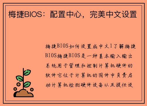 梅捷BIOS如何设置成中文 1. 了解梅捷BIOS 梅捷BIOS是一种基本输入输出系统,用于管理和控制计算机硬件的软件。它位于计算机的固件中,负责启动计算机、检测硬件设备以及提供设置选项。梅捷BIOS...